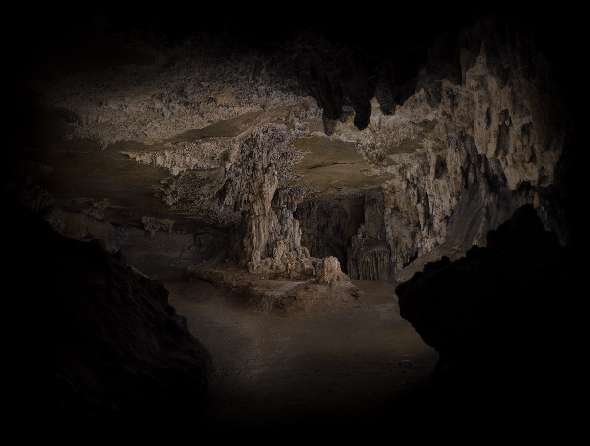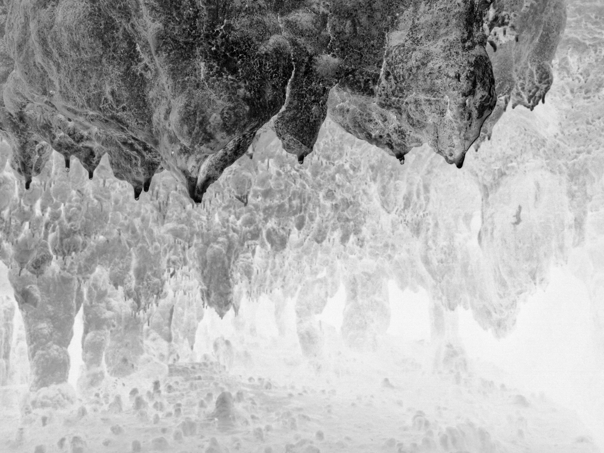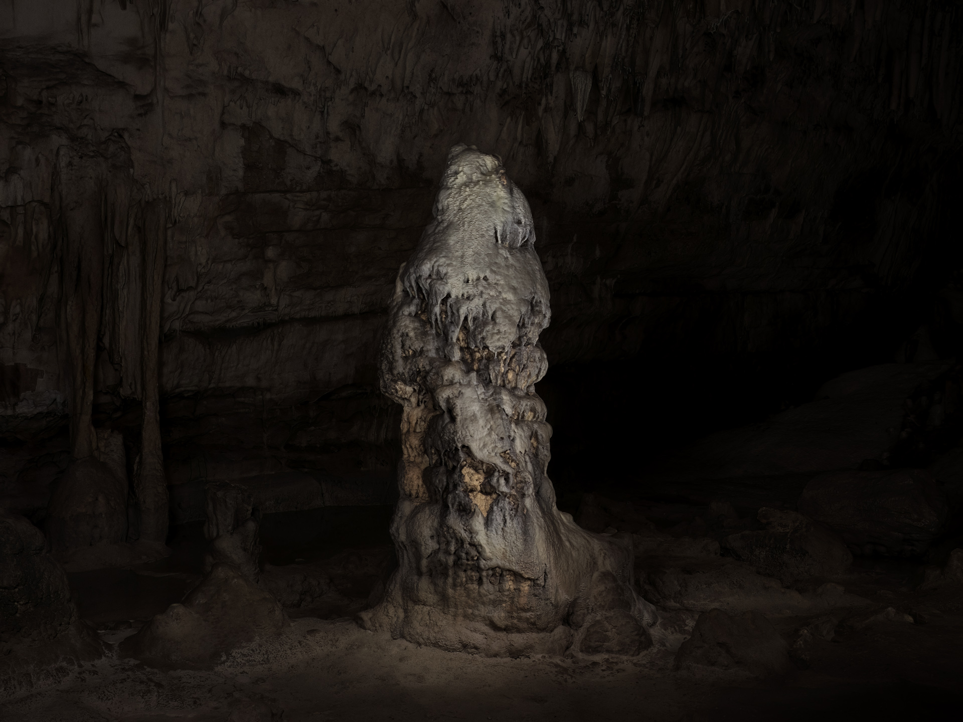 In La main de l’enfant (2021–2023), she photographs deep inside a mineral-rich cave, where air stands still and walls bear the imprint of time. Using long exposures and delicate lighting, she reveals what persists in silence and shadow. Light redraws space, turning stone into apparition. Each image becomes a patient, tactile encounter with matter and memory. This series speaks not of the past, but of a living presence—one that flickers in the dark, clings to rock, and recalls where fire once moved across the walls.