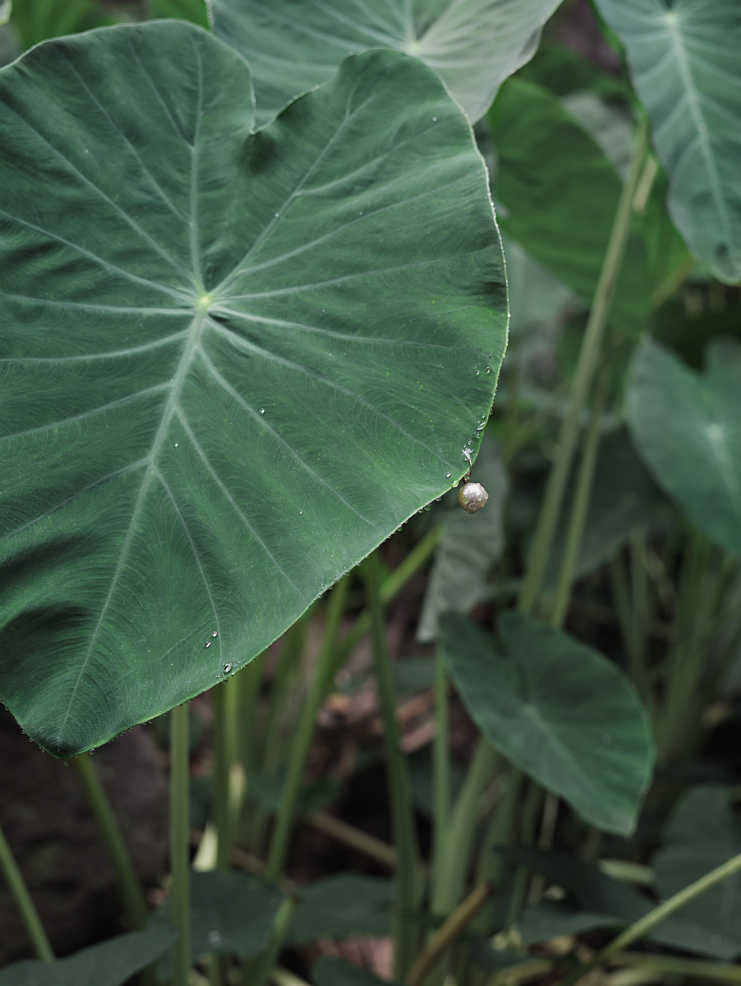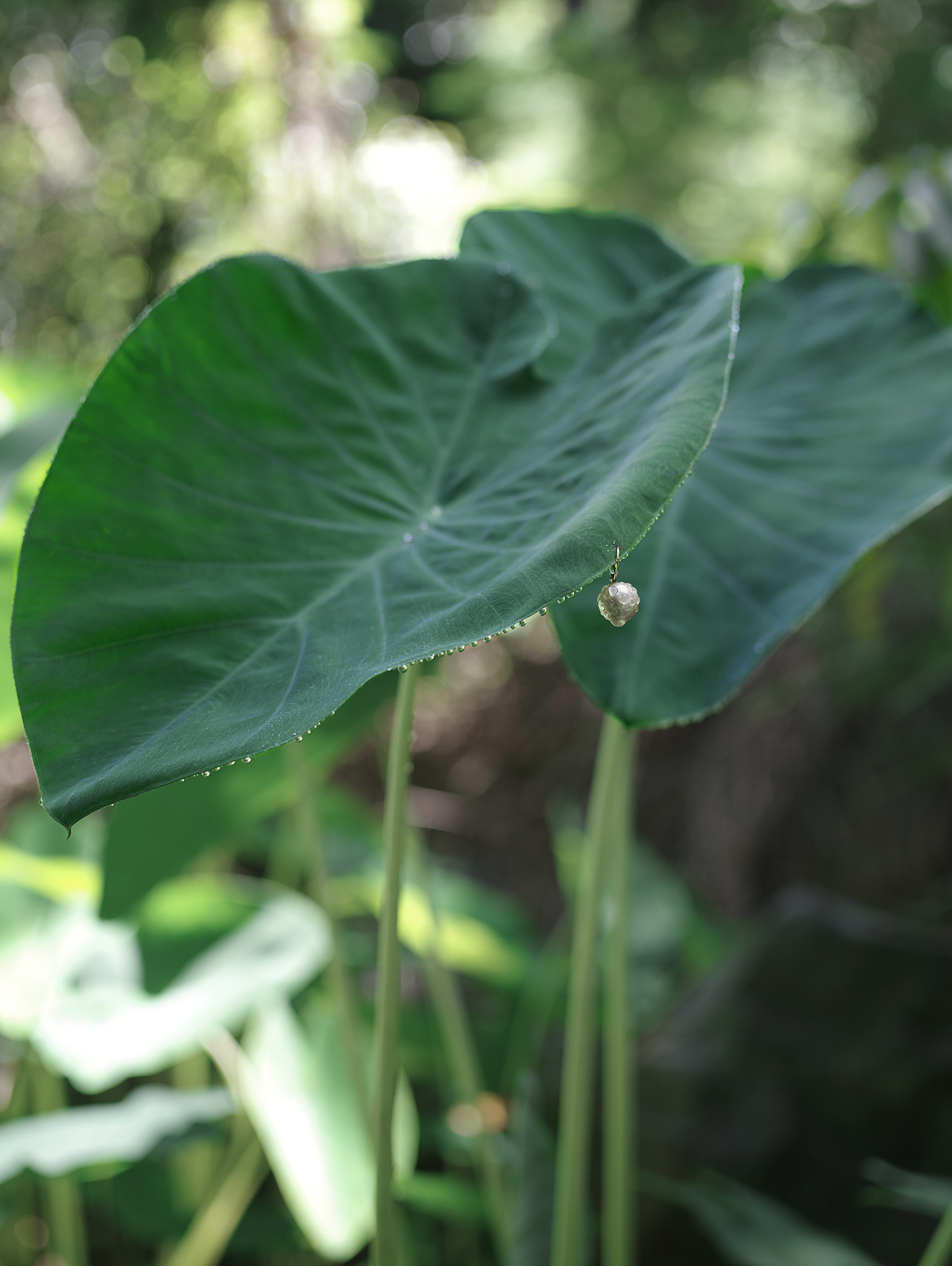In the humid stillness of a Réunion orchard, Thierry FONTAINE places one or two pearls on the broad leaves of taro, mango, vanilla or cacao — as if dressing them, gently, like bodies. Each surface becomes a skin, each pearl a bead of sweat, an earring, a breath. Sueur (2012-2022) evokes the quiet traces of labour, especially that of women in the plantations — the intimacy between hand and plant, adornment and care.