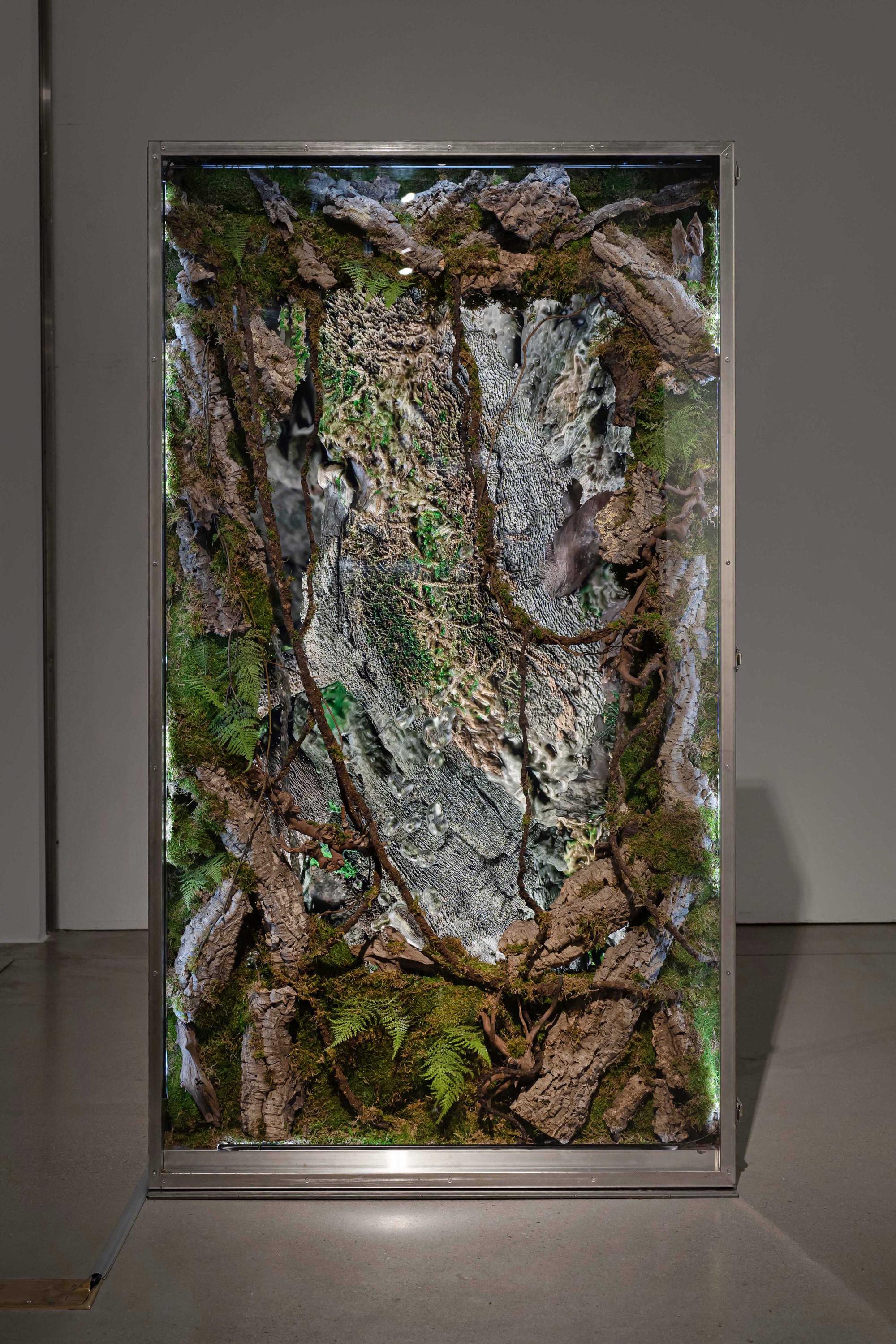 A deep realm where no shadows draw combines the artificial ecosystem of a terrarium with digital technology, presenting a complex landscape that evokes unfamiliar sensations as reality and illusion penetrate each other. Images photographed from actual nature are transformed and expanded through 3D rendering and displacement mapping techniques, while the dead branches and preserved moss inside the terrarium disrupt the boundaries between nature and artifice, life and non-life. GOO appropriates the ways in which digital sensibility restructures reality, inserting heterogeneous tensions and subtle fissures within familiar images of nature. Through this, viewers are positioned to contemplate in multiple layers the contemporary environment where the real and the artificial, nature and technology are intertwined.
