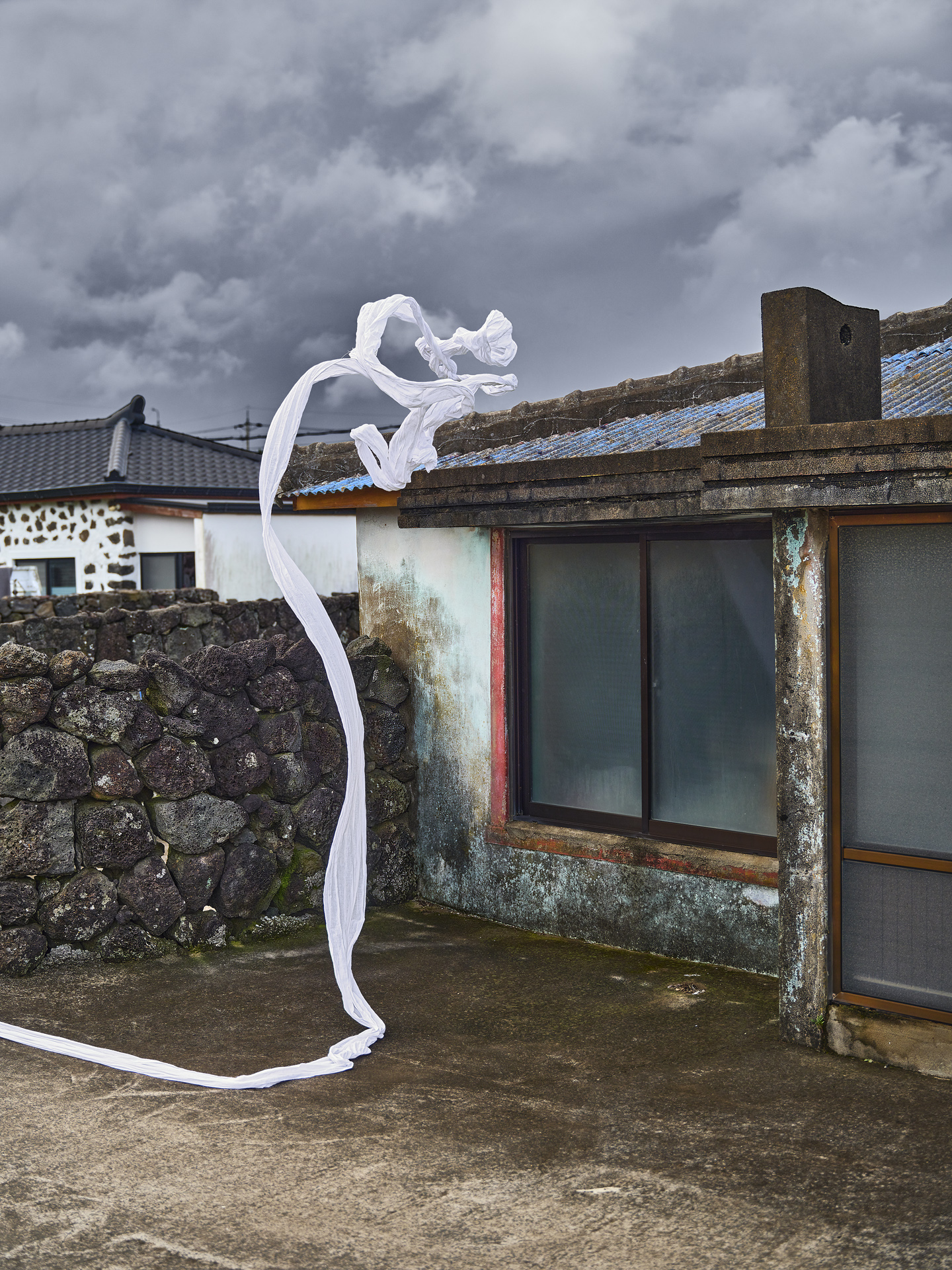 Their joint project In Storm’s Fold (2023) captures the drifting of sochang, a traditional Korean cloth symbolizing life and death, through a flood-stricken village in Jeju. The work evokes fading traditions, ecological crisis, and quiet resilience.