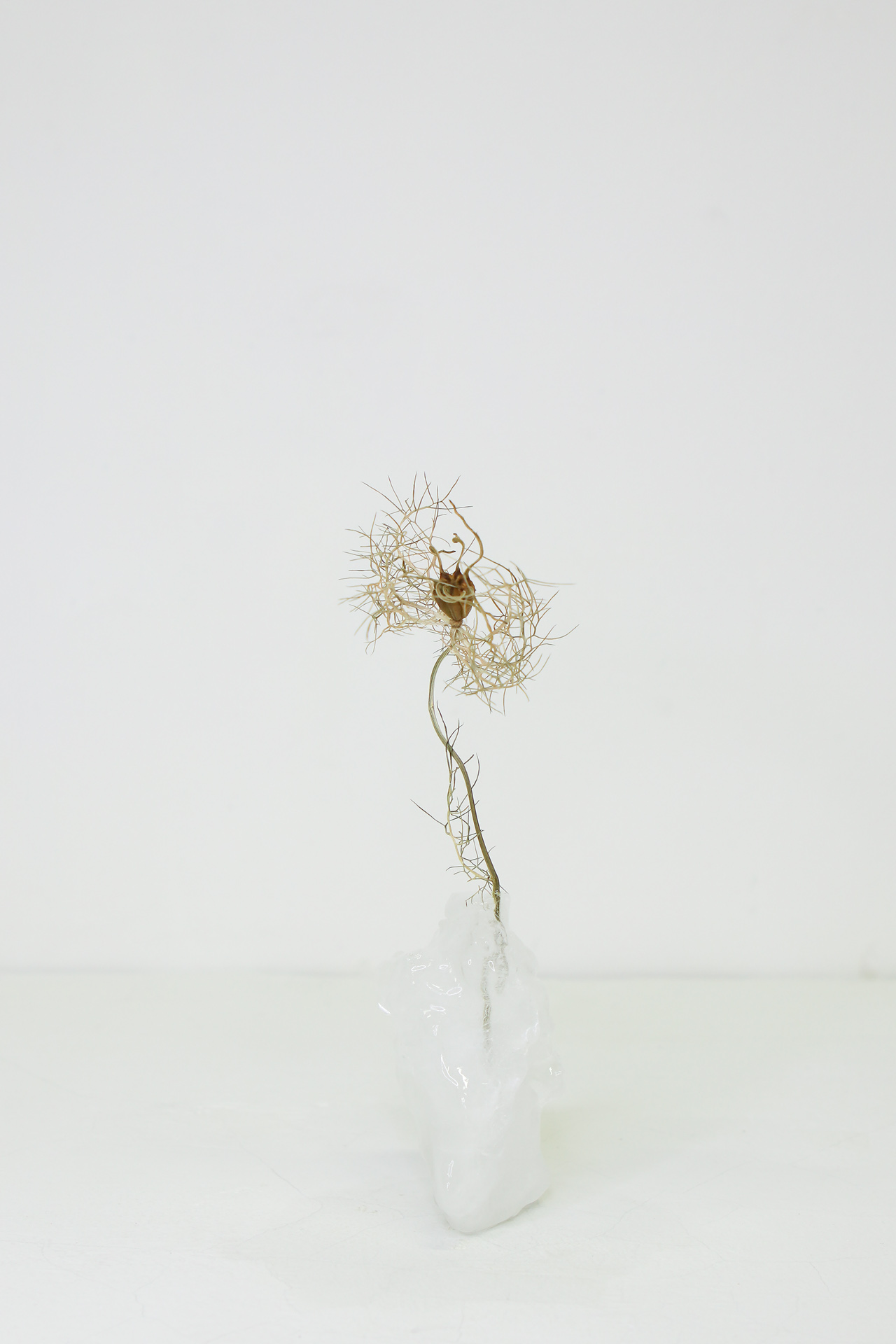 In From no-w-here, KWON photographs flowers frozen in blocks of ice. The series shown here, created with a digital camera, is printed and affixed directly to the wall. These images, reminiscent of still lifes, echo the vanitas tradition, where impermanence invites reflection on the value of life. “This work,” writes the artist, “proposes a dynamic vision of existence where nature and artifice, the organic and the inorganic, merge and evolve.