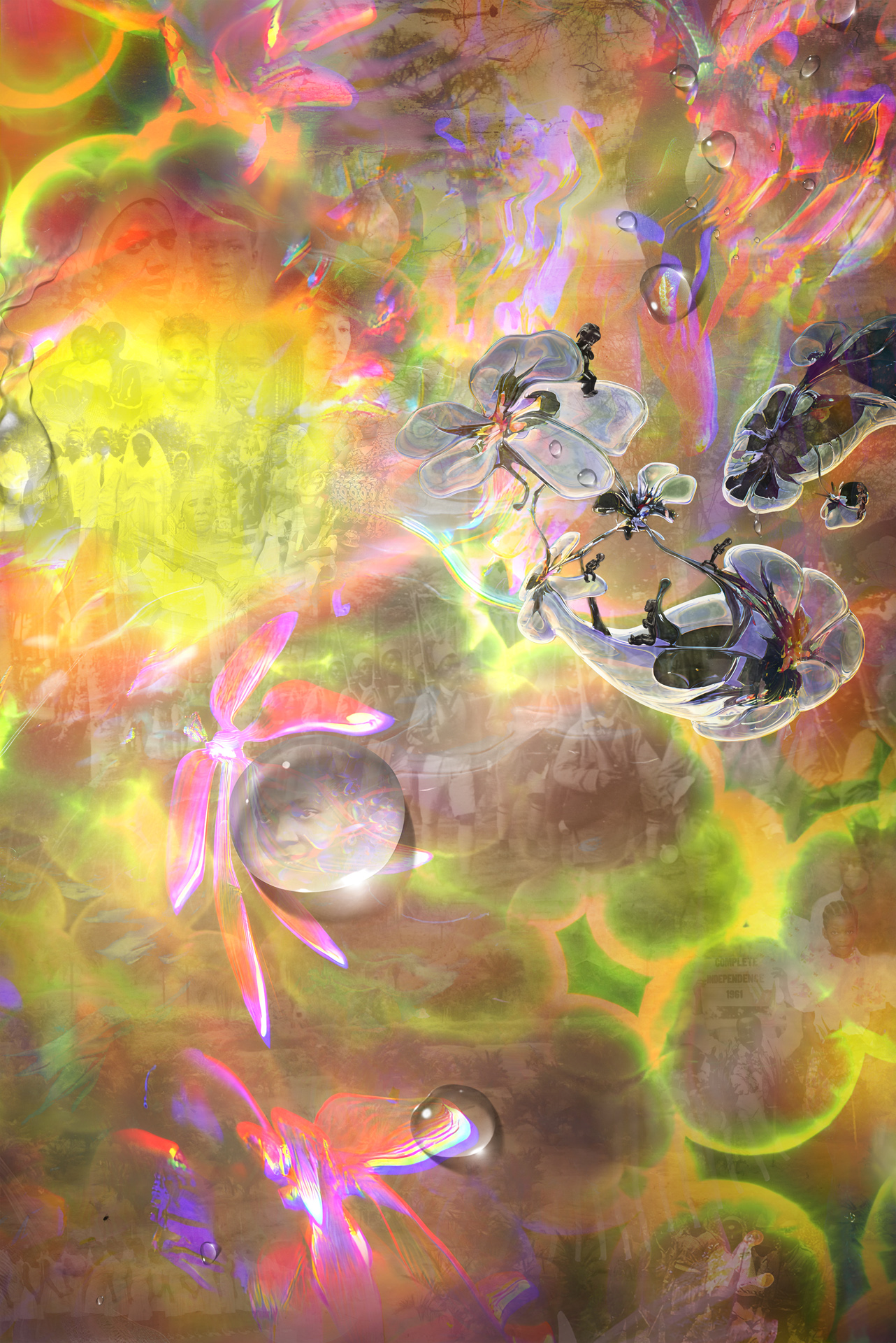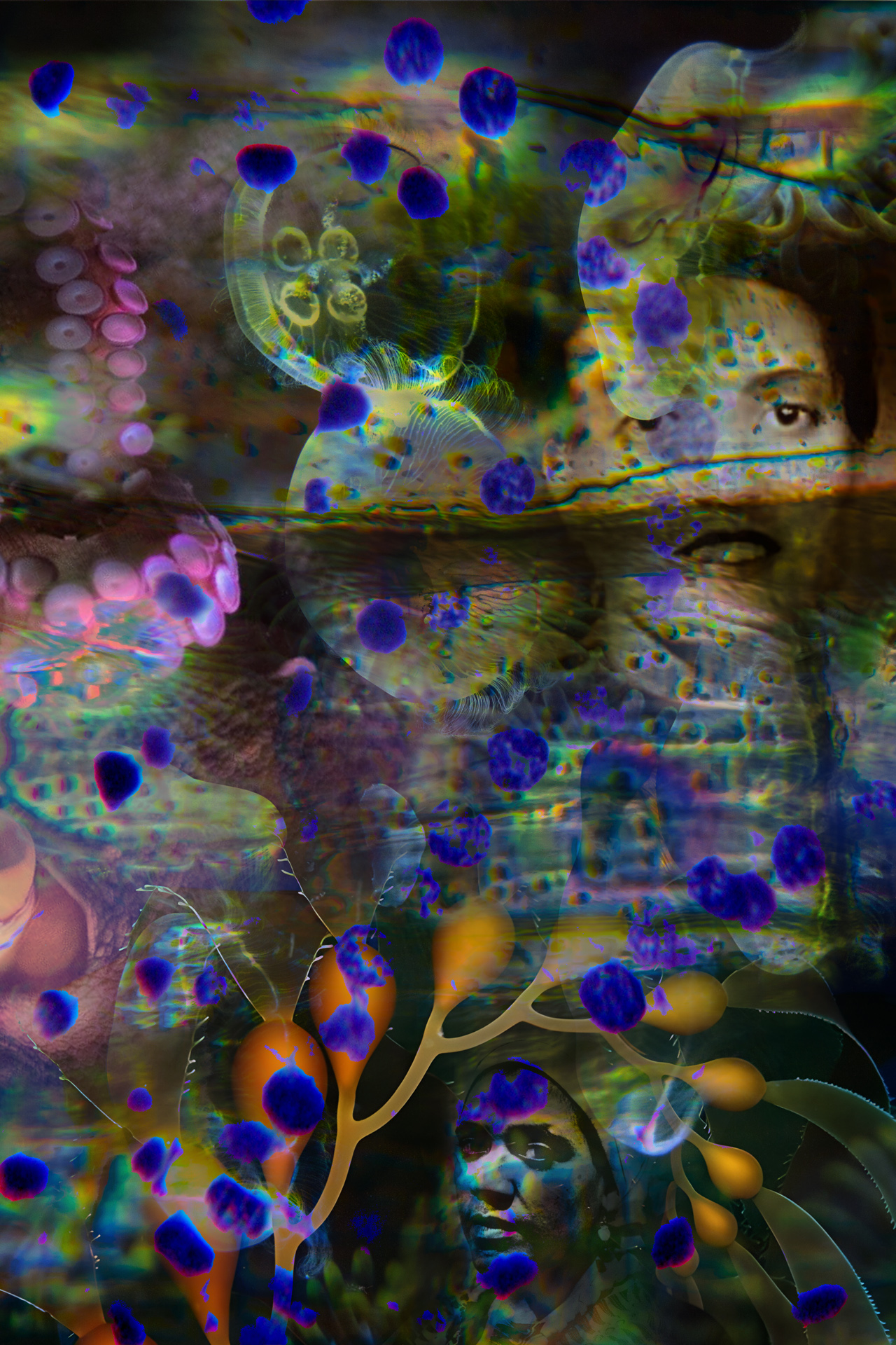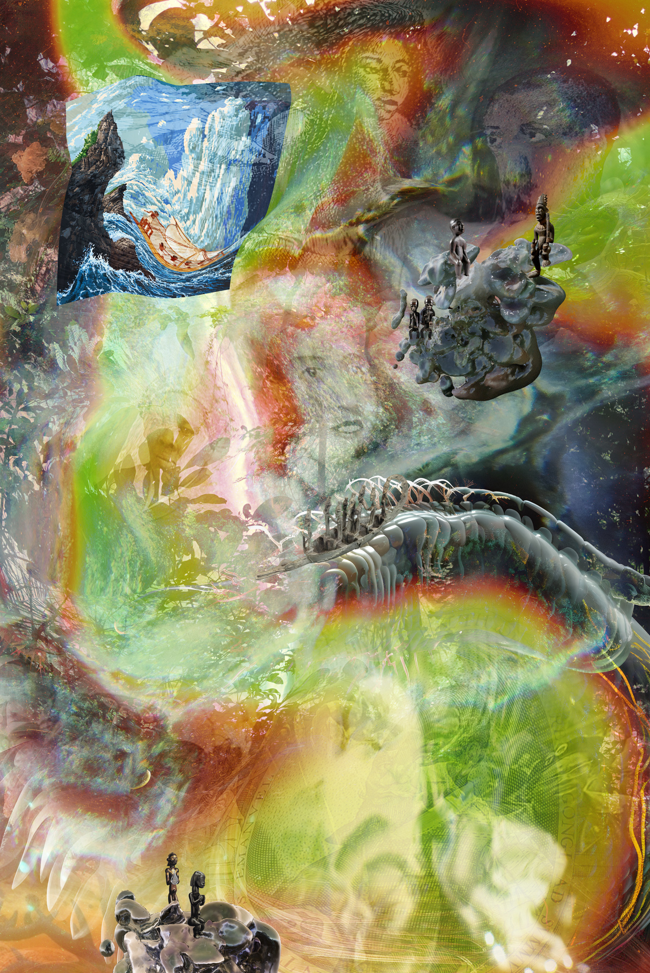 Drawing from science, mythology, internet imagery, and ancestral narratives, she deconstructs dominant stories of identity, history, and origin. Her art imagines interstitial worlds—blending cosmic, geological, and speculative dimensions—to explore alternative ways of perceiving, belonging, and becoming.